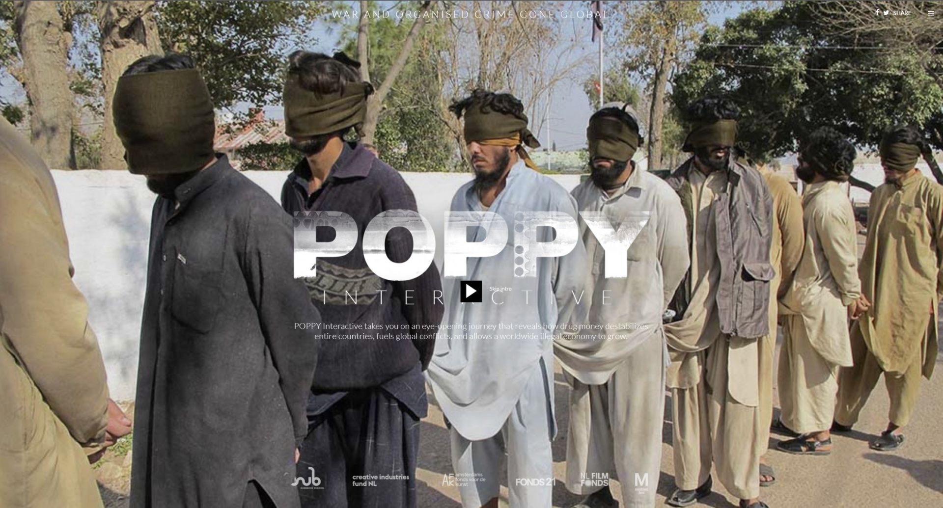 Nie sposób nie wspomnieć o Poppy Interactive70 fotografa Roberta Knotha i reportażystki Antoinette de Jong (2017). To interaktywne rozwinięcie projektu, który rozpoczęła książka Poppy: Trails of Afghan Heroin71 i towarzysząca jej wielokanałowa instalacja wideo. W ramach pracy duet ukazywał miejsca przemocy i chaosu połączone przez międzynarodowe szlaki przerzutu heroiny, walk rozniecanych przez powstańców, organizacje przestępcze i skorumpowane bądź nieudolne rządy. Podczas gdy książkowa wersja Poppy siłą rzeczy skupia się na fotografiach i tekstach, wersja wystawiennicza to panoramiczna instalacja wideo o dużej sile immersji, w której fragmenty wideo i obrazy nakładają się na siebie, prowadzone przez głos autorki; widownia, siedząca na miękkich poduszkach, może dać się ponieść narracji o ludziach, miejscach, konfliktach. Wersja cyfrowa stawia na relacje przestrzenne: dzięki możliwościom, jakie dają cyfrowe narzędzia, twórcy umieszczają na interaktywnej mapie trzy główne szlaki przerzutu heroiny (bałkański, północny i południowy) i pozwalają nam podróżować wzdłuż nich, zatrzymując się w kluczowych punktach, by obejrzeć kolejne migawki ujawniające tę pajęczynę oplatającą nasz glob.