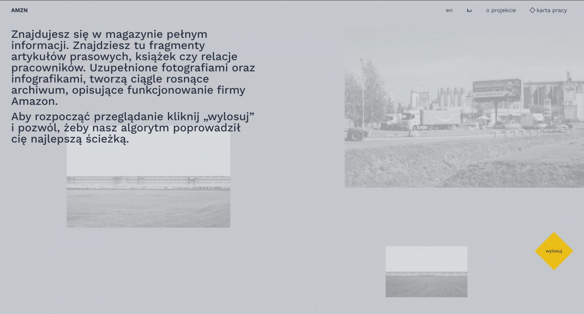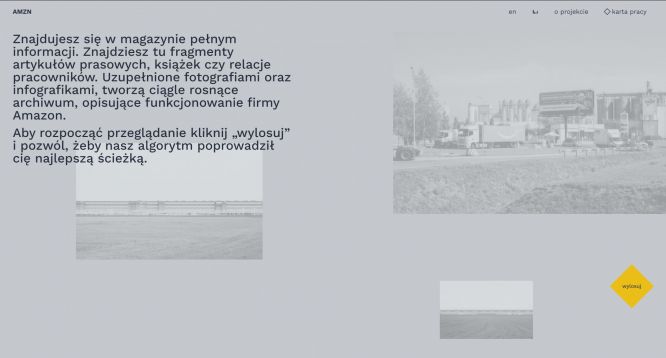 AMZN Tytusa Szabelskiego to interaktywne archiwum wytworzonych lub też zebranych przez twórcę materiałów, które mają pomóc naświetlić sposoby, w jakie Amazon, największy globalny dostawca detaliczny, zmienia rozumienie, rytm i strukturę pracy w współczesnym świecie. Celem doświadczenia cyfrowego AMZN było od samego początku poruszenie osób odbiorczych – do myślenia, do działania, do wykorzystania materiałów zebranych w tym cyfrowym magazynie do własnych celów, inicjatyw, rozmów, akcji. Właśnie dlatego każda osoba po zakończeniu sesji może ściągnąć wszystkie obejrzane i przeczytane materiały na własny komputer. W tym sensie AMZN stanowi zasób, uzupełnienie wystawienniczej wersji projektu76, pozwalający osobom uczestniczącym w wystawie „uruchomić” znajdujące się tam obrazy i obiekty, zamienić je w impet – polityczny, twórczy. Po ukończeniu projektu postanowiliśmy sami sprawdzić w działaniu możliwości, jakie daje AMZN.vnLab.org.