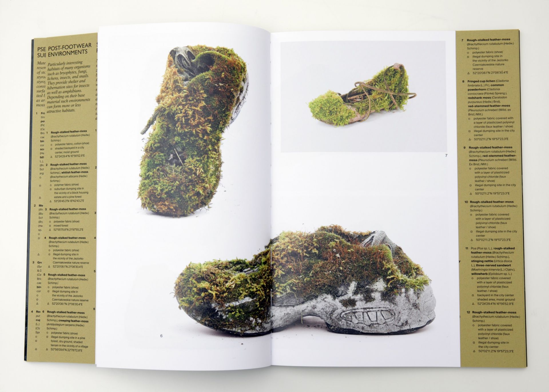 To bliscy nieznajomi, pogrupowani na stronach Atlasu w kilka sekcji. Czasem, tak jak w przypadku „środowisk po-obuwniczych”, bez trudu rozpoznajemy, czym niegdyś był ów „materiał post-przedmiotowy” – spod darni różnych gatunków krótkoszów tu i ówdzie wyłania się dawna podeszwa, nosek, przyszwa czy obłożyna, rzuca się w oczy wytłoczone logo powszechnie znanej marki. Podobnie rzecz ma się ze „środowiskami po-tekstylnymi”; poszczególne, jak to, które tworzą rzeżucha włochata i brodek murowy oraz torebka damska, są swoistymi transi – artystka pochwyciła tu artefakt w procesie, gdy wskazujący na „od-ludzkość” człon „arte” stopniowo traci na znaczeniu. Pośród „habitatów po-elektronicznych” widzimy płytę główną, z którą brodek murowy tworzy układ rzeczywiście scalony. Więcej kłopotu przy identyfikacji sprawiają „podłoża skałopodobne” – tworzące je płyty pilśniowe, gąbki czy pianki poliuretanowe szybko tracą wizualną swoistość i upodobniają się do skał litych i sypkich. Sfotografowane przez Dianę Lelonek w tych kompozycjach, których wiodącą zasadą jest dekompozycja tego, co cywilizacyjne, mają coś z tradycyjnej estetyki japońskiej, przypominają porośnięte mchem suiseki, tym bardziej wskazując wyjście poza naznaczony dychotomiami zachodni sposób myślenia. Sugerują związek mikro- i makrokosmosu, aluzyjnie kierują w stronę buddyjskich nauk o wiecznej przemianie i braku własnej istoty.