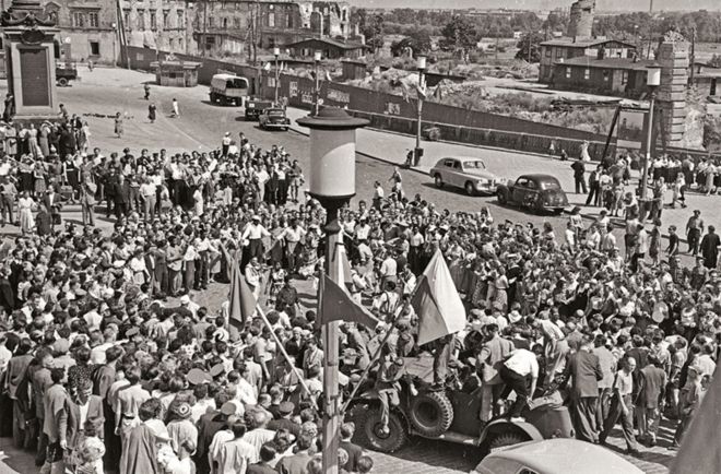 V Światowy Festiwal Młodzieży i Studentów w Warszawie, 1955. Festiwalowicze tańczą pod kolumną Zygmunta, w tle ruiny Zamku Królewskiego. Zbiory Narodowego Archiwum Cyfrowego