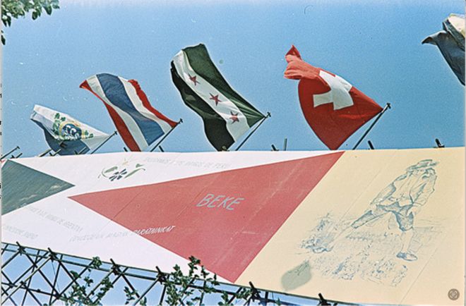 Dekoracyjny fryz autorstwa Wojciecha Fangora i Henryka Tomaszewskiego wzdłuż ulicy Marszałkowskiej w Warszawie z okazji V Światowego Festiwalu Młodzieży i Studentów, 1955. Fot. Wojciech Jankowski, zbiory Muzeum Warszawy