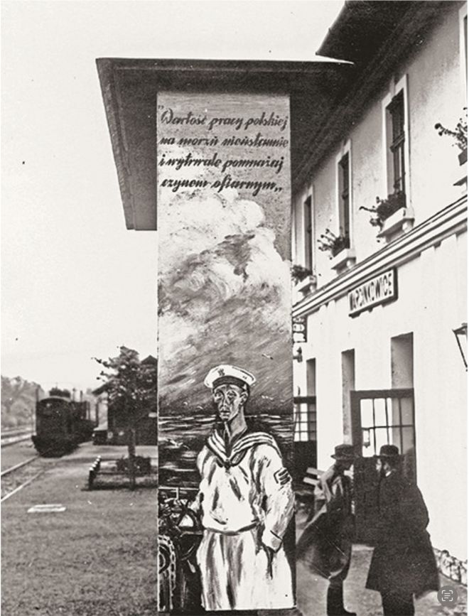 Mural propagandowy Ligi Morskiej i Kolonialnej w Marcinkowicach niedaleko Nowego Sącza około 1936 roku. Zbiory Narodowego Archiwum Cyfrowego