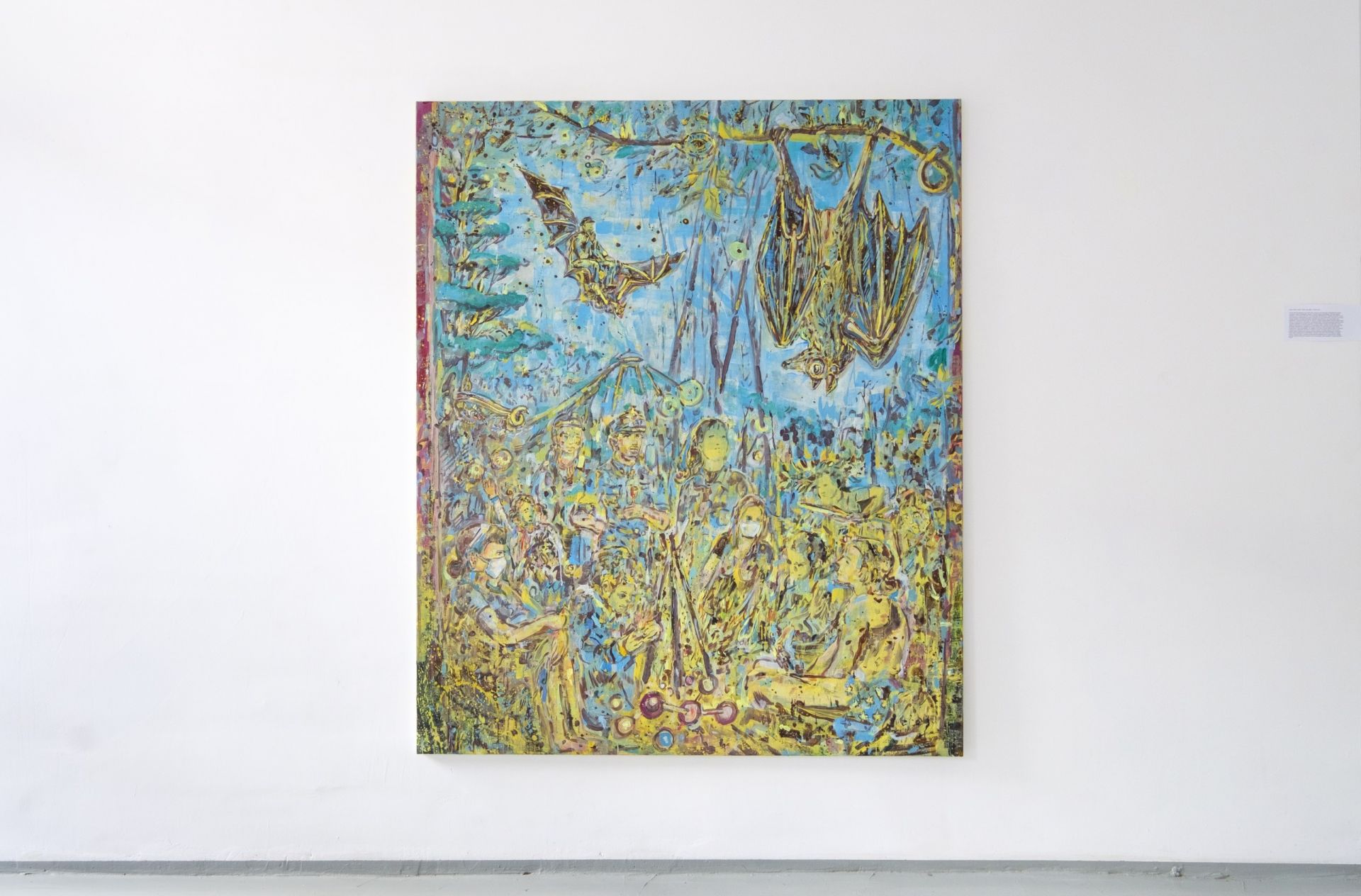 Jedną z prac wybranych przez kuratorkę był obraz Adama Adacha Iskra (il. 1). Na utrzymanym w stonowanych odcieniach żółci, błękitów, brązów i zieleni płótnie możemy zauważyć najróżniejsze postaci kobiece, choć uważne oko zauważy wśród nich również mężczyznę w stroju policjanta. Niektóre z przedstawionych na obrazie kobiet zakrywają usta maseczkami medycznymi. Nad tą całą niezwykle gęstą i stłoczoną kompozycją unoszą się olbrzymie nietoperze, które zdają się uważnie obserwować splątane ze sobą ludzkie postaci. W interpretacji zarówno artysty, jak i kuratorki, obraz odnosi się do czasu pandemii i lockdownu, a także otwarcia wystawy. Był to moment kryzysowy, który jak każda sytuacja graniczna, obnaża struktury przemocy i symbolicznego napięcia.