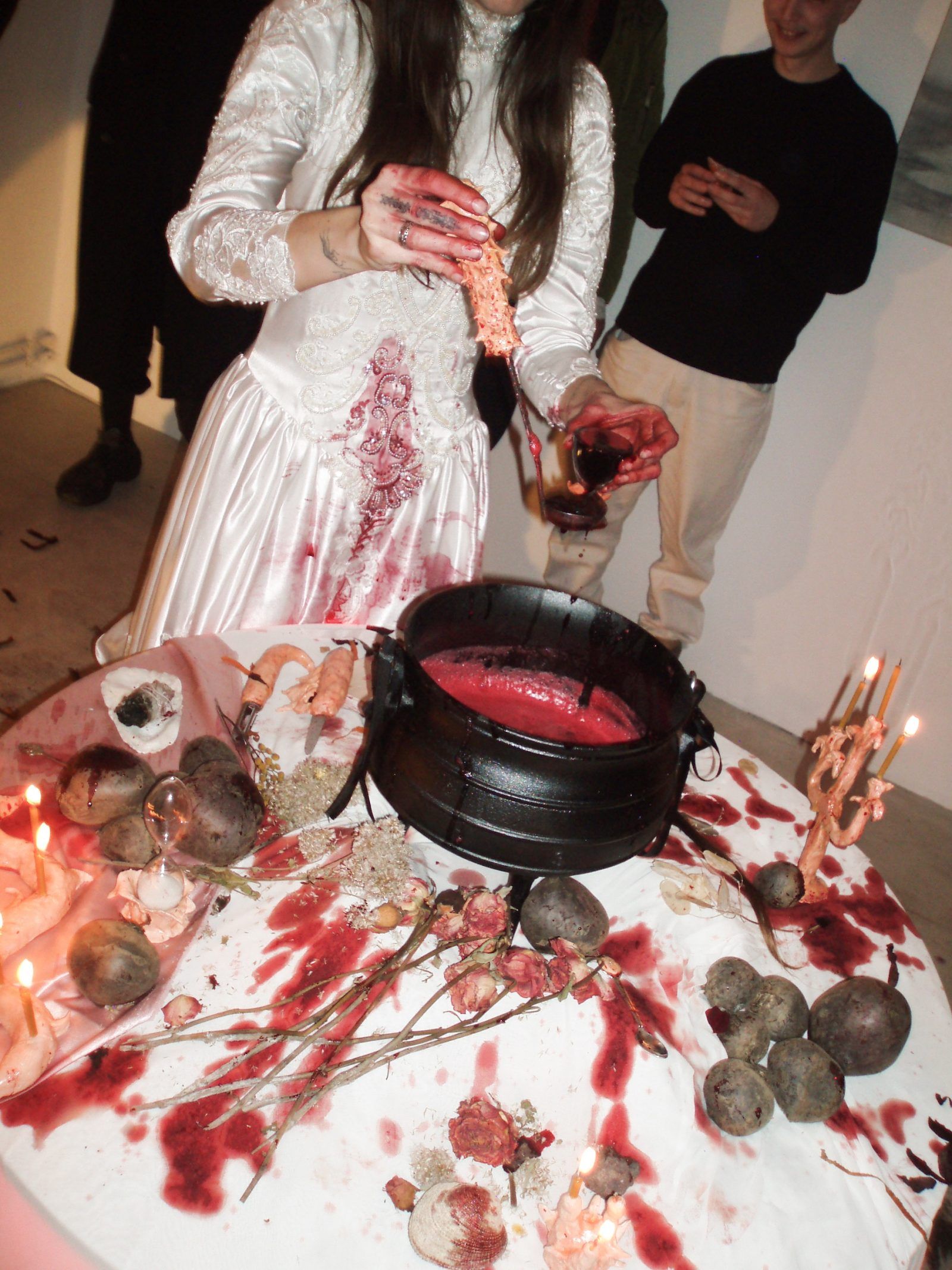 Puff pijąc i dzieląc się podczas wernisażu z uczestnikami wyciskanym własnoręcznie sokiem z buraka, odgrywała przedziwny performans (il. 15). Z jednej strony jest on symbolicznym aktem kanibalizmu, gdyż zjadane przez artystkę korzenie charakteryzują się nie tylko niezwykłą mocą, ale są symbolem pokiereszowanych i zapomnianych kobiet. Z drugiej strony jest on aktem budowania świadomości i pewnego oczyszczenia. Wypijając symboliczną krew tych kobiet bohaterka wchłania ich wiedzę i włącza ją w swoje ciało. Wiedza czarownicy jest zatem także wiedzą zmarłych, których historia stanowi nasze korzenie. Jest także wiedzą ciała, bo wynika z naszych zmysłowych doświadczeń.