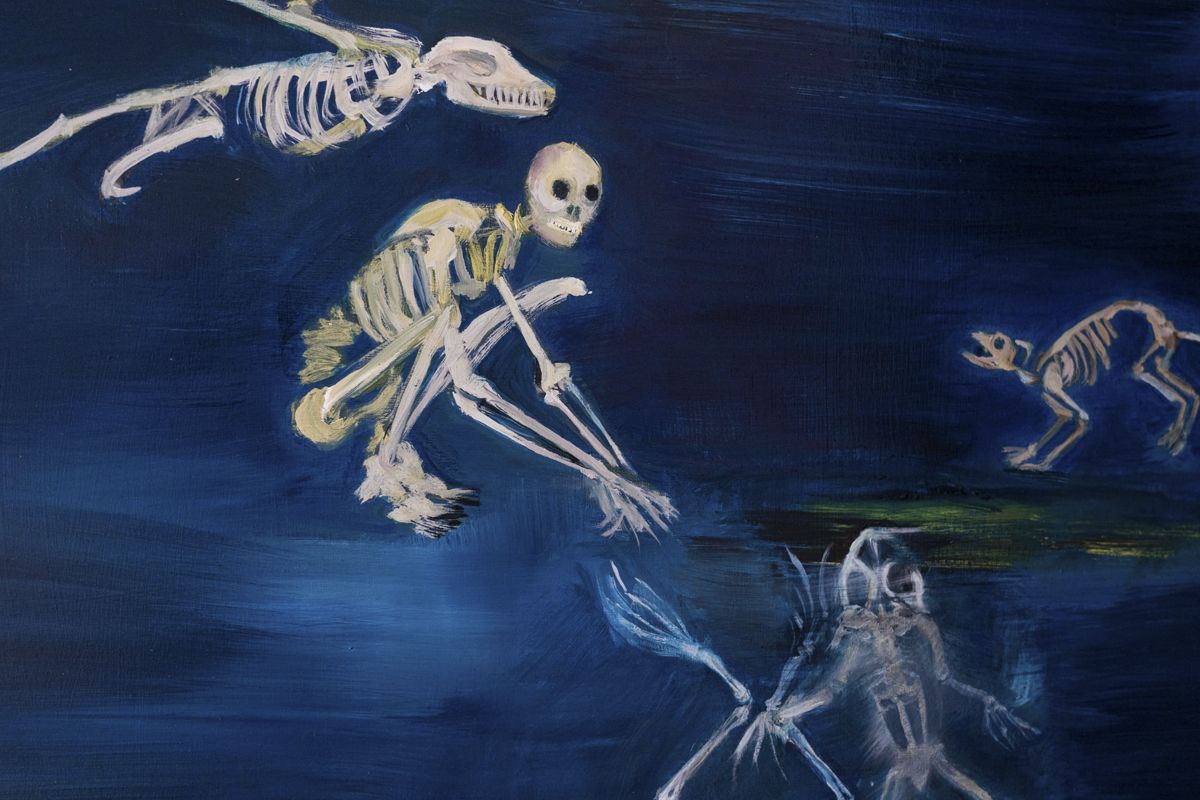 W podziemnej krainie zmarłych, kryją się jeszcze inne istoty, odgrywające rolę przewodniczek po tym dziwnym i mrocznym świecie. Jego powidoki widzimy na wystawie Sabat w formie obrazów Luki Woźniczko (il.16). Za tańczącymi szkieletami ukrywają się byty o potężnej sile. Oczkowska wymienia ich imiona: Hekate i Persefona94. Pierwsza to grecka tytania magii, rozdroży, nekromancji, czarów, duchów i pani upiorów. Druga to władczyni podziemnego świata i opiekunka dusz zmarłych. Nie są to jedyne imiona tych pradawnych istot. Kuratorki Odczarować czarownice wspominają Babę Jagę95, upiorną staruchę będącą powidokiem najprawdopodobniej słowiańskiego bóstwa inicjacyjnego96. Z kolei kuratorki Magicznego zaangażowania przywołują wiele imion tej istoty: „sumeryjska Uttu, według Nawahów Na’ashjé’ii Asdzáá, grecka Arachne, w mitologii kultury Hopi Kokyangwuti – kobieta poza czasem, reprezentująca wszystko to, co dobre, wzywana w chwilach, gdy potrzebna jest rada i opieka, nazywana jest też pajęczą babcią”97.