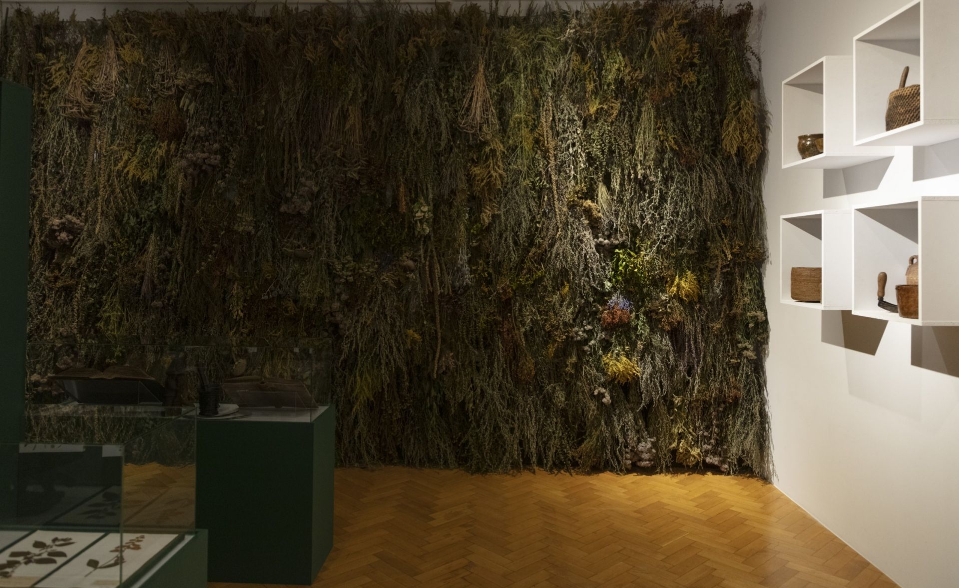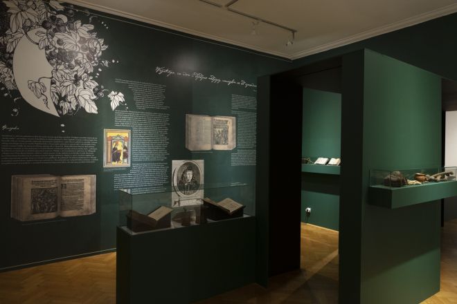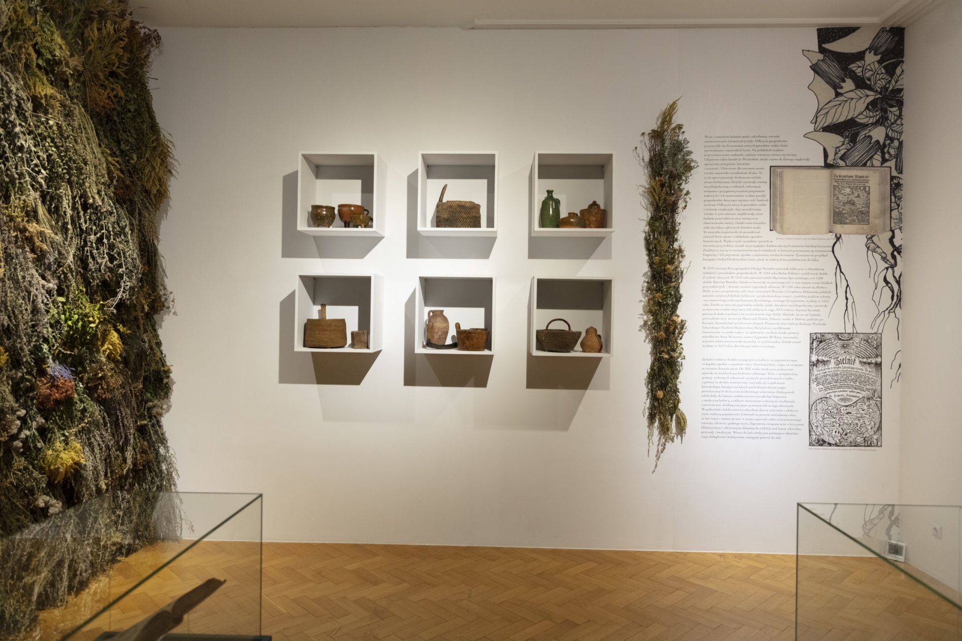 Kojarzone z procesami o czary zielarki, znachorki i łączone z nimi zioła, rośliny o magicznych właściwościach, ale także tajemnicze mikstury i eliksiry pojawiają się także na pozostałych wystawach i pełnią w nich ważną funkcję. Elementem, który szczególnie rzuca się w oczy, gdy przeglądamy archiwalne zdjęcia z katowickiej wystawy Odczarować czarownice. Wiedźmy, wieszczki, zielarki, jest nie tylko głęboka i intensywna zieleń ścian, ale pojawiające się na niej gdzieniegdzie narysowane białą kreską przedstawienia roślin (il. 3). Ponadto jedną z sal wystawy kuratorki wypełniły intensywnie pachnącymi ziołami.