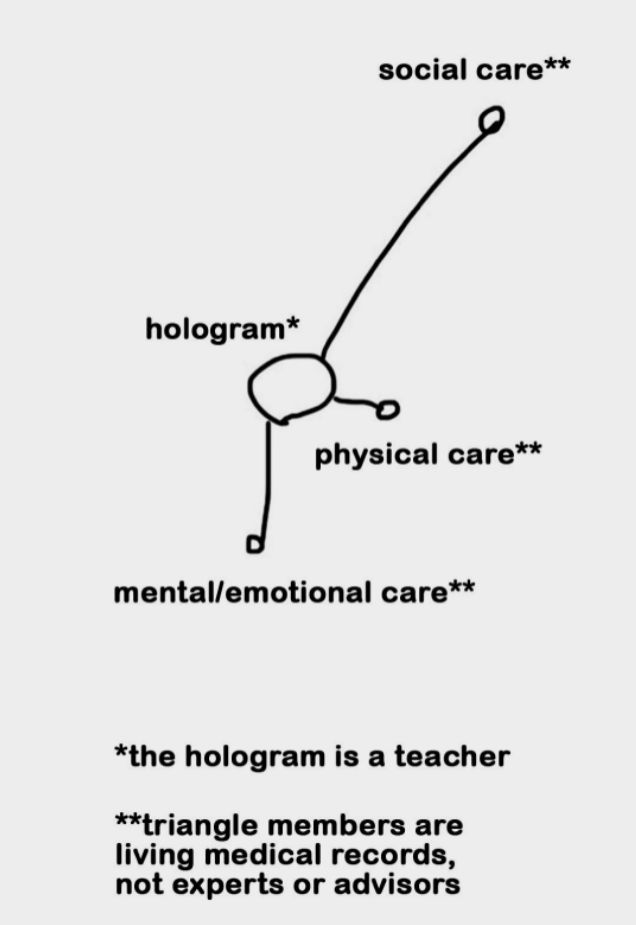 opieka społeczna/fizyczna/mentalna/emocjonalna. Hologram jest nauczycielem. Członkowie trójkąta to żywa kartoteka medyczna, ani eksperci ani doradcy.