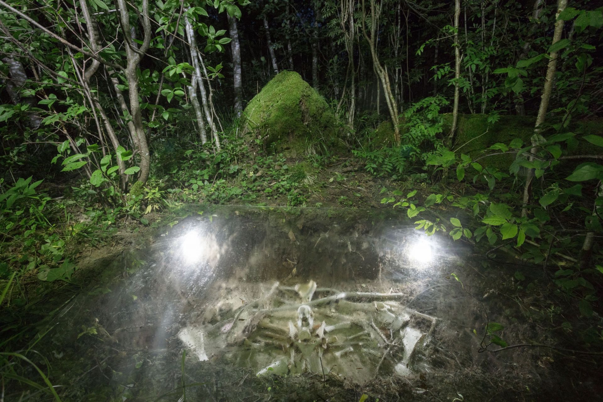 W lesie Savvaļa, gdzie zainstalowano pracę, widzka patrzyła z góry na mały, prostokątny, szklany staw umieszczony między drzewami. Musiała zejść z coraz mniej widocznej ścieżki, by stanąć przy jego krawędzi, pochylając się, by uniknąć zadrapania przez gałęzie. W tej dziwnej pozycji ukształtowanej przez otaczający las, z ciałem odbijającym jego obraz, patrzyła przez szklany panel i widziała małe i większe białe kości, czaszkę, szczątki kiedyś żywych istot — dowody śmierci ułożone wraz z patyczkami i przedmiotami, tworzące nieludzką, małą, lecz monstrualną figurę. Materialne sekrety gromadzone przez Neiburgę przez wiele lat i wystawione pod samochodowymi szybami w lesie to obscena należące do ziemi. Są sekretami i wydzielinami. Niesamowitymi jelitami ziemi.