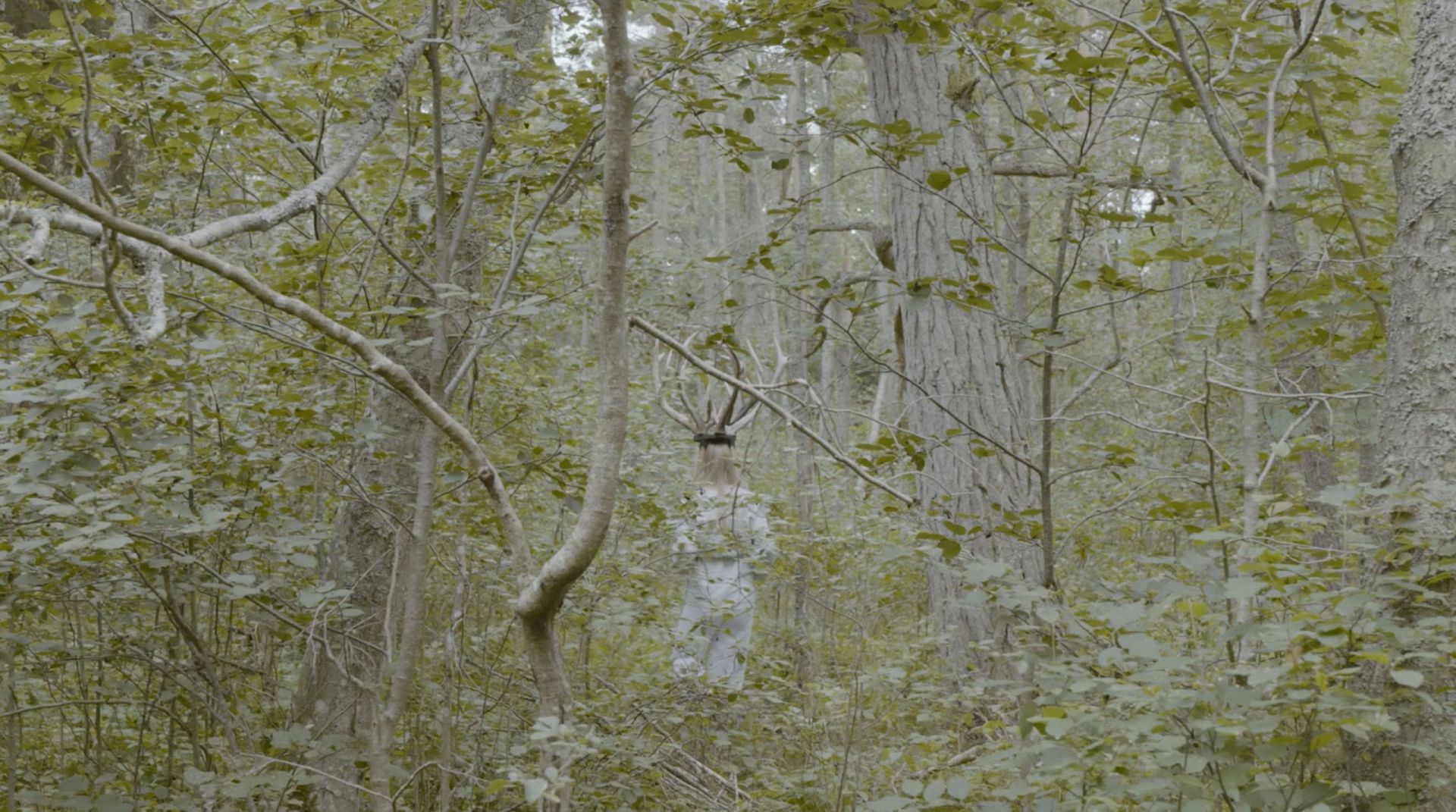 W pewnym momencie kadr wypełnia pokryte mchem leśne podłoże — powalone pnie, suche liście i gęsta zieleń niemal całkowicie wypełniają obraz. Spomiędzy dwóch omszonych kłód, tuż przy ziemi, wyziera głowa starszej osoby z krótkimi siwymi włosami — oczy ledwo wystają ponad korę. Efekt jest niesamowity: postać zdaje się wyrastać z samego lasu, jakby z niego wyłoniła lub została przez niego połknięta, a granica między człowiekiem a puszczą niemal się zatarła. Napis na dole kadru głosi: „Zwierzę? hm — nie…” — zawieszony między humorem a niepokojem, ujmuje coś istotnego w duchu tej pracy. Postać nie jest ani w pełni ludzka, ani w pełni leśna — tkwi w tej przestrzeni liminalnej, do której Neiburga powraca wciąż na nowo: na progu, gdzie jaźń się rozpuszcza, a coś starszego, dziwniejszego zajmuje jej miejsce.