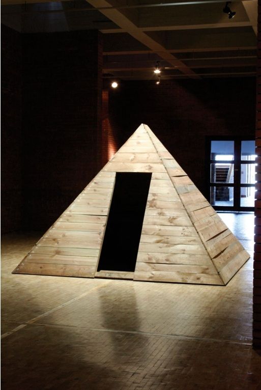 Wskazane powyżej ideowe przesunięcie oddaje instalacja pod tytułem Piramida. Sztuka jako doświadczenie wewnętrzne (1979), której towarzyszył cykl rytualnych działań-seansów. Na wrocławskich Stabłowicach artystka zbudowała drewnianą konstrukcję wzorowaną na piramidzie Cheopsa49 (il. 3). We wnętrzu budowli odbywały się eksperymenty polegające na wprowadzaniu jej samej lub wybranych osób w stan śnienia. Zdaniem artystki seanse polegające na generowaniu stanu onirycznego umożliwiały wejście w sferę pogłębionej autorefleksji, polegającej na uświadomieniu sobie łączności nie tylko z poprzednimi pokoleniami, lecz także z innymi gatunkami zamieszkującymi Ziemię. Wskazywała na inspiracje tych działań psychotroniką, gałęzią parapsychologii rozpowszechnioną w latach 60. i 70. w krajach bloku wschodniego, zwłaszcza Czechosłowacji. Według tej paranauki określone formy lub kształty geometryczne umożliwiały skupienie energii mentalnej50.